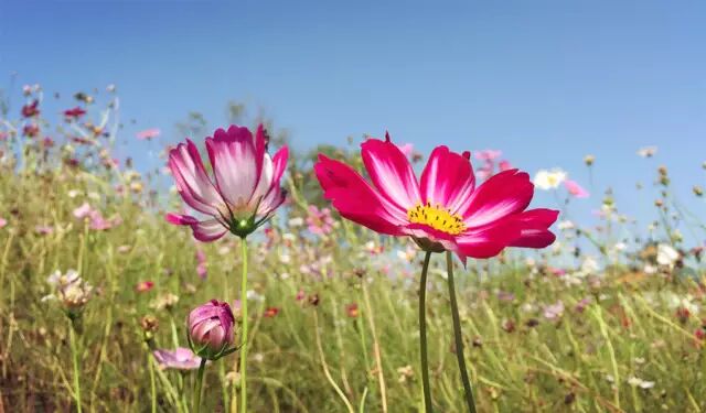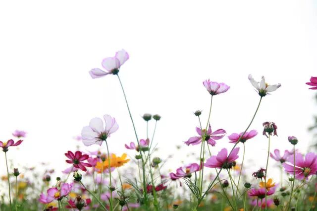 除了几条小路,粉色、白色、黄色的格桑花铺天盖地,整个花田犹如一副绚丽多彩的油画画布。
