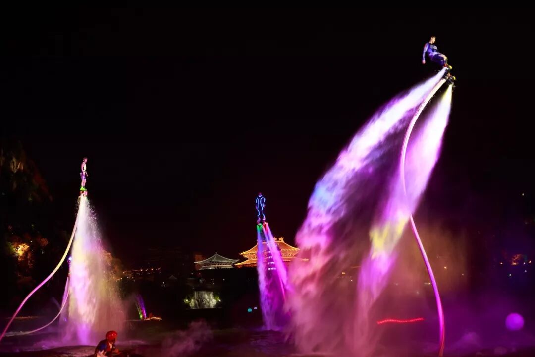翡翠湾的白天,是风光旖旎的灵湖一景;晚上,这里是一个酷炫的水上飞人秀场。灯光、焰火、水上特技等综合应用,将给大家带来震撼的视听体验。
