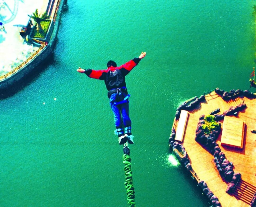 科学原理:弹性势能、重力势能、动能;能力转换及守恒定律,自由落体运动。由于空气阻力的作用,能量不断减少,人最终安然无恙,停在空中。