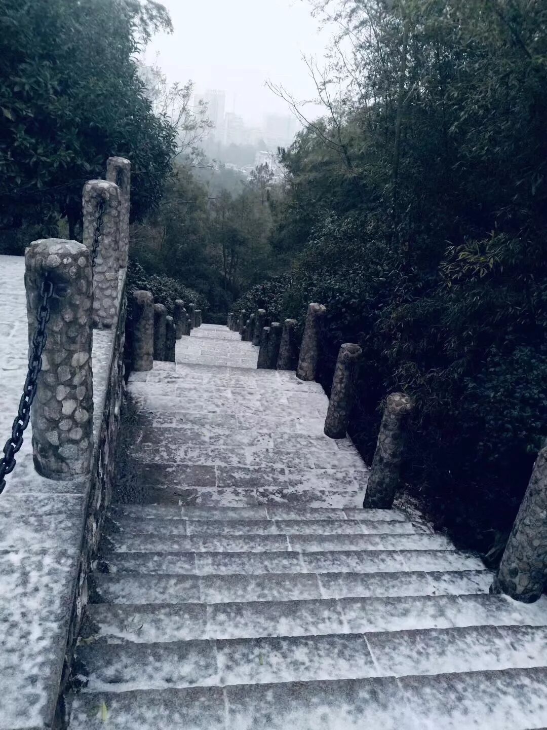 登往福满天的台阶上也雪白一片,此时登高祈福、观雪景的你可得当心脚下湿滑,出门游玩、安全第一!