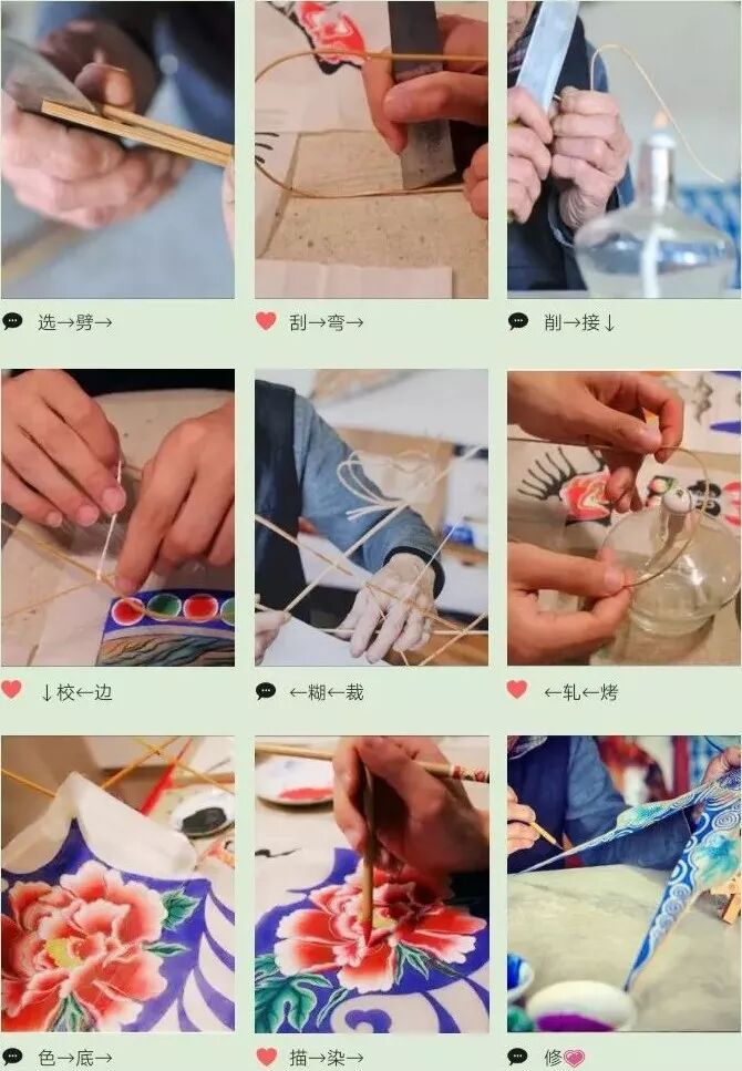 传统风筝手工技艺:扎、糊、绘、放,简称“四艺”。即扎架子、糊纸面、绘花彩、放风筝。