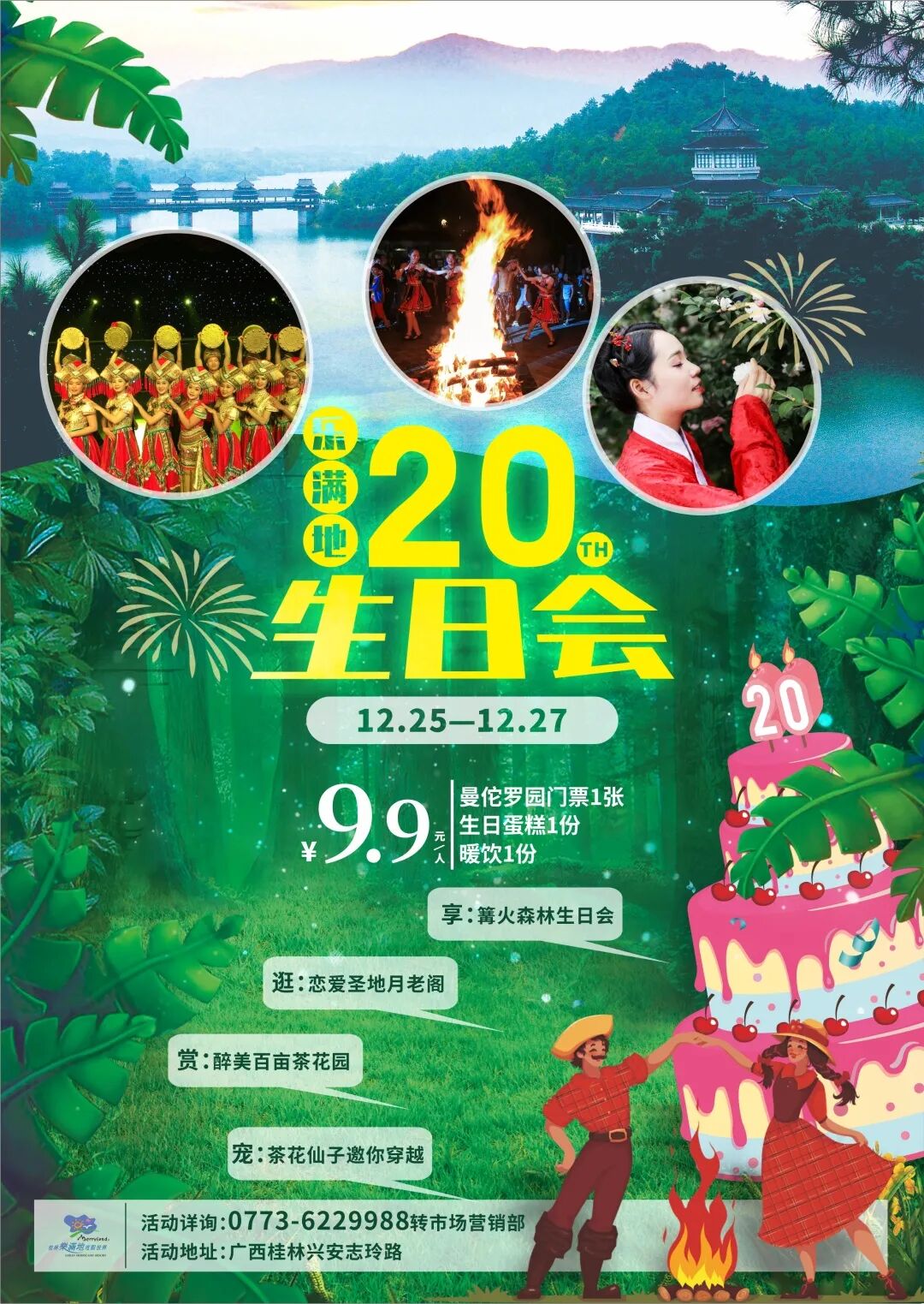 二十周年生日会周年庆时间:2020年12月25-27日周年庆地点:乐满地曼佗罗园活动内容:篝火、舞蹈、热饮、蛋糕茶花、祈福、游园9.9元周年庆门票长按识别二维码二十周年庆生日会畅游曼佗罗园漫步园区,观冬日灵湖之静谧。寒风瑟瑟,风雨桥傲立湖面。月老阁,恋爱圣地,携手约定。灵宋古道,古香古色,梦回宋朝。灵宋古道同享生日蛋糕、热饮邀您同享二十周年生日蛋糕,更为您准备了热饮,温暖整个冬天。古戏台联袂演绎茶花仙子,婀娜多姿,为您翩翩起舞,热情似火,舞动心扉,所以,更需要一场火焰,牵手狂欢。邀您一起欢跳竹竿舞白日篝火狂欢乐满地的冬日,从不寒冷。熊熊烈火,点燃希冀,与乐同行二十载,欢乐满地再出发。欢声笑语,喷火表演,惊险刺激中一起跳舞吧!赏百亩茶花百亩茶花,为您而开!冬日的五彩缤纷,尽情按下快门,留住芳华!更多福利添加小乐微信喔~~▼