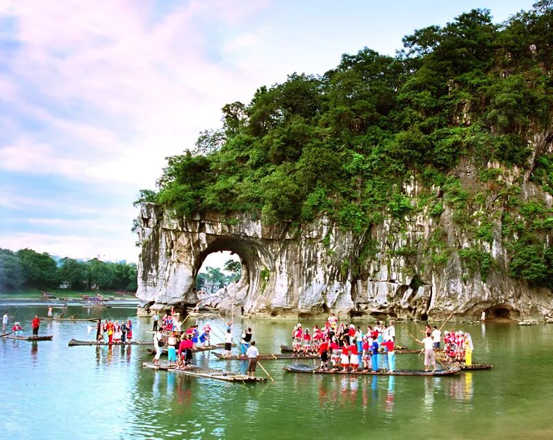 象鼻山是桂林的城徽山,是桂林旅游的标志山,它坐落在桂林市中心的漓江与桃花江汇流处,形似一头鼻子伸进漓江饮水的巨象,象鼻和象腿之间是面积约一百五十平米的圆洞,江水穿洞而过,如明月浮水。坐落西岸的象山水月与漓江东岸的穿月岩相对,一挂于天,一浮于水,形成“漓江双月”的奇特景观。除了象鼻山本身,景区还有水月洞、爱情岛、普贤塔、三花酒窖等景点。