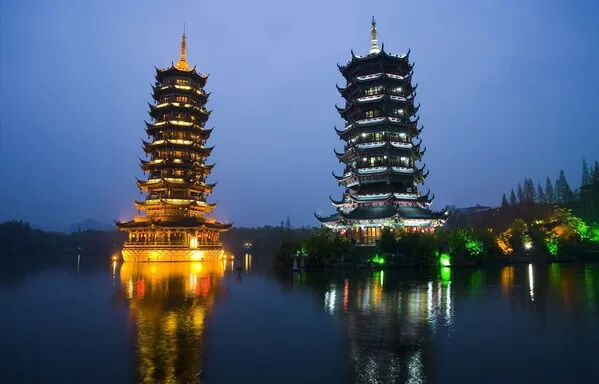 两江四湖包括了桂林市中心区的漓江、桃花江以及杉湖、榕湖、桂湖、木龙湖,是桂林城市中心较优美的环城风景带,也是桂林的风景名片。坐游船是游览两江四湖的主要方式,尤其是晚上坐船,可以从多角度欣赏桂林夜景。