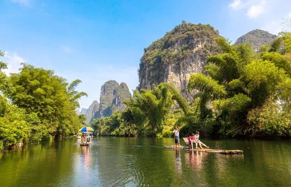 桂林漓江景区是国家5A级景区,是世界上风景美,规模大的岩溶山水游览区之一。漓江隶属于珠江水系,发源于桂林市兴安县的猫儿山山脉,全长437公里。精华的景色是在杨堤乡至兴坪镇约20公里的水程,杨堤竹筏是很多人都会选择的,杨堤—兴坪段是漓江最精华的部分,乘竹筏漂流可以亲近大自然和漓江山水,吹着风一路欣赏清澈的江水和岸边的美景,很有趣味。