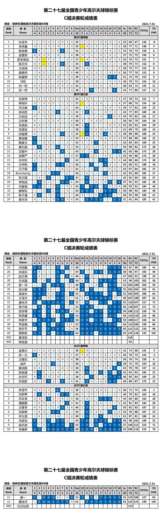 男C乙组伍彦铮今日打出72杆的成绩超过昨日并列第一张尚哲、何文锦来到领先榜首位,以两轮151(79-72)杆的成绩拿下C组乙组冠军。韩锐轩、何汶锦分别夺得亚军和季军。